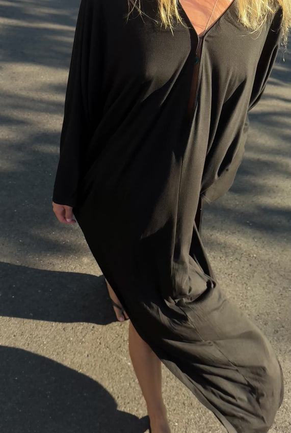 A plunging neckline, high slits exposing the legs on either side, and a breathable fabric that lays effortlessly on the skin with maximum comfort—introducing the Nadia Kaftan. This piece will be your new go-to, evolving from casual to elevated wear, embodied by the classic kaftan silhouette, a design reminiscent of the 1970s. She’s somewhere between St Tropez and Paris, worn night or day, and always sexy and chic.